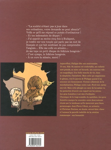 Aujourd'hui. Philippe fête son anniversaire. 53 ans, déjà. Sa maison est confortable, ses enfants sont grands, sa mère est bavarde, son nouveau vélo est magnifique. Une belle tranche de vie, dans la simplicité, l'honnêteté. Mais celui qui empoisonne le gâteau, c'est le patron de Philippe quand il lui annonce son licenciement. Victime collatérale de la mondialisation, Philippe coule à pic. Perd tout, même son toit. Mais cette plongée au coeur de lui-même va lui permettre d'ouvrir son regard sur les autres. Les gens honnêtes n'ont rien d'ordinaire. Chronique de la tragi-comédie du quotidien, Les gens honnêtes marque la rencontre entre deux auteurs réunis par la tendresse qu'ils éprouvent pour leurs personnages. Jean-Pierre Gibrat, au scénario, et Christian Durieux, au dessin, savent faire vibrer l'unisson la parcelle indicible de la création romanesque : son humanité.