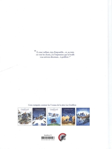 "A coeur vaillant, rien d'impossible... et, au train où vont les choses, j'ai l'impression que la bouffe vous arrivera désormais... à godillots ! ". Lors de la Guerre de 14-18, le caporal Palette et du soldat Le Bourhis, deux "poilus" ordinaires, se retrouvent plongés dans des événements qui ne le sont pas. Accompagnés de Bichette, un ado qu'ils ont pris sous leur aile, et d'un petit singe vert espiègle nommé Salopiot, ils sont chargés de la "roulante" (la cantine) et du ravitaillement des premières lignes. Ils vivent la guerre à hauteur d'homme et ne se prennent pas pour des héros - ce qui ne les empêche pas de faire preuve d'héroïsme quand les circonstances l'imposent. Retrouvez l'intégrale des 5 aventures des Godillots, pleines de rebondissements et de camaraderie au milieu des tranchées de la Grande Guerre. Une tout autre façon de raconter le premier conflit mondial, entre humour, humanisme et rigueur historique.