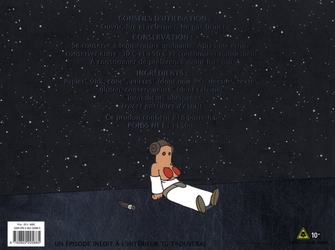 Conseils d'utilisation : ouvrir, lire et refermer. Ne pas brûler. Conservation : se conserve à température ambiante. Après ouverture, conserver entre -30°C et +50°C et consommer rapidement. A consommer de préférence avant fin : oui. Ingrédients : papier 98%, colle, encres (dont noir 5%), dessin, texte, gluten, conservateurs (dont caféine). Ingrédient allergènes : traces possibles d'esprit. Ce produit contient 218 portions. Poids net : 1130g.