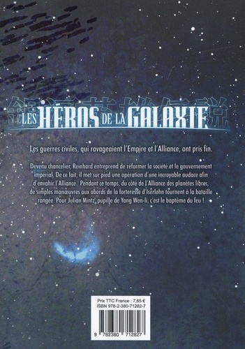 Voici la saga héroïque contant le destin de deux hommes d'exception, à qui reviendra la tâche de mettre fin à une interminable guerre galactique !! Les guerres civiles qui ravageaient l'Empire et l'Alliance respectivement, ont pris fin. Devenu chancelier, Reinhard entreprend de réformer la société et le gouvernement impérial. Puis il met sur pied une opération d'une incroyable audace afin d'envahir l'Alliance. Pendant ce temps, du côté de l'Alliance des Planètes Libres, de simples manoeuvres aux abords de la forteresse d'Iserlohn tournent à la bataille rangée. Pour Julian Mintz, pupille adoptif de Yang Wen-li, c'est le baptême du feu !