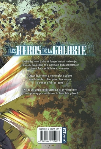 Voici la saga héroïque contant le destin de deux hommes d'exception, à qui reviendra la tâche de mettre fin à une interminable guerre galactique !! Reinhard se résout à affronter Yang en mettant sa vie en jeu ! La bataille qui décidera de la suprématie des Forces Impériales ou des Forces de l'Alliance va commencer. Chacun des stratèges a conçu un plan et se lance dans la bataille. . Mais qui des deux trouvera le premier la faille de l'autre ? Plus qu'une simple bataille spatiale, c'est un véritable duel à mort qui s'engage et qui décidera du destin de la galaxie !