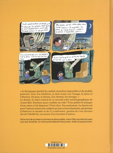 Après la Synagogue, Joann Sfar replonge dans son passé et son enfance, après la mort de sa mère qui aboutit à un sentiment de vide étourdissant pour cet enfant. A l'occasion d'une analyse, Joann revient sur cet événement et explique à son psy ce qui a fait qu'il a préféré embrasser la vie, s'adonner sans limite à sa passion : l'art (la peinture et la bande dessinée en tête), ce qui fait qu'on se sent vivant, notamment par l'acte de la création par le dessin et l'écriture. "Un vide, ça se remplit" , lui confie son psy. Le seul fait de fabriquer des images permet de remplir ce vide et de créer de nouveaux souvenirs : Joann avoue qu'il accorde ainsi beaucoup d'importance aux images. Cet échange vient aussi en écho d'une conversation, lorsqu'il était plus jeune, avec un rabbin. Peut-on figer le souvenir d'un défunt, de sa propre mère, par une image ? Lorsqu'on s'en remet à une image plutôt qu'au monde, cela ne devient-il pas de l'idolâtrie ? Une image interdit-elle toute forme de dialogue ou de confrontation au monde ? Ou, au contraire, dessiner et surtout raconter (le propre de la bande dessinée) n'est-il pas une forme de liberté, d'ouverture et de compréhension du monde qui nous entoure ? Finalement, n'est-ce pas là une forme de thérapie ? ... Par un jeu d'allers et retours à différents moments de sa vie et par le biais de nombreux intervenants, Joann revient sur les actes fondateurs de son existence, entre la perte de sa mère disparue trop tôt et son propre chemin qui l'a amené à se consacrer à la création dont le dessin, parfois de façon compulsive, comme on embrasserait une religion. A la fois récit philosophique et introspectif, cette histoire permet à l'auteur de se livrer avec une sincérité rare, livrant une véritable réflexion sur le sens de la vie. Un livre puissant, touchant, d'une grande intelligence et, finalement, une ode à la vie !