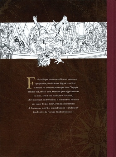 De l'ancien au Nouveau Monde, la fabuleuse épopée d'un vaurien en quête de fortune... En 160 pages au très grand format, le dessinateur de Blacksad et le scénariste de De Cape et de Crocs nous offrent cet album d'exception qui constitue leur Livre d'Or ! Fripouille sympathique, don Pablos de Ségovie fait le récit de ses aventures picaresques dans cette Amérique qu'on appelait encore les Indes au siècle d'or. Tour à tour misérable et richissime, adoré et conspué, ses tribulations le mèneront des bas-fonds aux palais, des pics de la Cordillère aux méandres de l'Amazone, jusqu'à ce lieu mythique du Nouveau Monde : l'Eldorado !