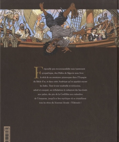 De l'ancien au Nouveau Monde, la fabuleuse épopée d'un vaurien en quête de fortune... En 160 pages au très grand format, le dessinateur de Blacksad et le scénariste de De Cape et de Crocs nous offrent cet album d'exception qui constitue leur Livre d'Or ! Fripouille sympathique, don Pablos de Ségovie fait le récit de ses aventures picaresques dans cette Amérique qu'on appelait encore les Indes au siècle d'or. Tour à tour misérable et richissime, adoré et conspué, ses tribulations le mèneront des bas-fonds aux palais, des pics de la Cordillère aux méandres de l'Amazone, jusqu'à ce lieu mythique du Nouveau Monde : l'Eldorado !