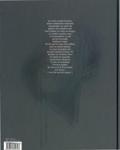 Sur scène, Joseph d'Anvers, auteur compositeur-interprète, accompagne ses textes de guitares aux tonalités rock. Pour traduire ces mots en images, il a confié sa poésie noire à un dessinateur et ami qui lui ressemble, Stéphane Perger. Né du coup de coeur d'un éditeur pour un artiste hybride, "Les Jours incandescents" permet à Joseph d'Anvers de décliner ses meilleurs titres en autant de nouvelles superbement illustrées. Le style est tranchant, l'univers sombre, les héros sur le fil du rasoir. Leur devise : "Live fast and die young !"
