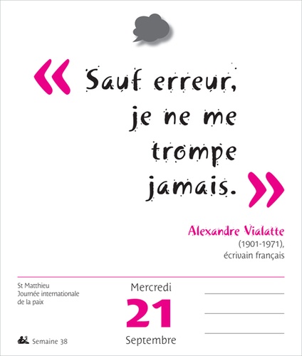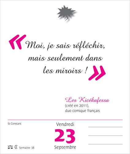 Un mot d’esprit par jour ! Les écrivains, les humoristes, et même les hommes politiques, ont toujours laissé à la postérité des formules saugrenues, pour notre plus grand plaisir. De Florence Foresti à Coluche, de Benjamin Franklin à Alphonse Allais ou Oscar Wilde, découvrez jour après jour toutes ces célèbres citations. Un festival d’humour !