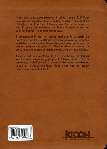 A son arrivée au campement du Pr Lake, l'équipe du Pr Dyer découvre un véritable charnier... Seul Gedney, l'assistant du biologiste, aurait vraisemblablement réussi à fuir en traîneau. Mais l'homme a-t-il réellement une chance de survivre dans ces contrées hostiles ? Rien n'est moins sûr... Il est pourtant le seul qui saurait expliquer le spectacle de désolation que les scientifiques ont sous les yeux, et surtout le mystérieux tumulus qui renfermait les spécimens décrits par son mentor quelques jours plus tôt ! Bien décidé à retrouver le disparu, le géologue part en expédition au-delà des montagnes...