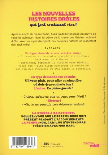 Enfin la suite de l'anthologie la plus hilarante ! Après le succès du premier tome, Alain Bouteiller poursuit son oeuvre de salubrité publique : réunir la crème de la crème des histoires vraiment drôles. Avec un esprit décapant, ces nouvelles histoires ne respectent rien, sauf le rire ! Extraits : Un type demande à une vieille dame : - Si vous aviez le choix, que choisiriez-vous : Parkinson ou Alzheimer ? - Parkinson, répondit la vieille sans hésiter. Parce que j'aime mieux renverser la moitié de mon vin que d'oublier où j'ai rangé la bouteille. Un type demande son chemin : S'il vous plaît, pour aller au cimetière, où dois-je prendre le bus ? L'autre : En pleine gueule ! - Chérie qu'est-ce que tu veux pour Noël ? - Divorcer ! - Ah, je ne pensais pas dépenser autant ! La gynéco à sa patiente : Voulez-vous que le père du bébé soit présent pendant l'accouchement ? La femme : non, car il ne s'entend pas très bien avec mon mari.