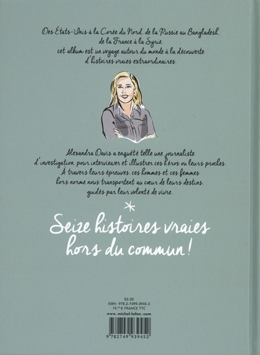 Des Etats-Unis à la Corée du Nord, de la Russie au Bangladesh, de la France à la Syrie, cet album est un voyage autour du monde à la découverte d'histoires vraies extraordinaires. Alexandra Davis a enquêté telle une journaliste d'investigation, pour interviewer et illustrer ces héros ou leurs proches. A travers leurs épreuves, ces hommes et ces femmes hors norme nous transportent au coeur de leurs destins guidés par leur volonté de vivre. Seize histoires vraies hors du commun !