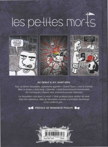 Qui a été la toute première faucheuse ? Comment mourait-on avec classe au Moyen-âge, en égypte ou pendant la Grande Guerre ? Embarquez dans cette drôle de croisière à travers la mort et le temps. Au début il n'y avait rien. Puis, la divine Yaourtière, autrement appelée " Grand Tout " , créa le monde. Mais le temps y était long. L'éternité, c'était bigrement interminable. On s'ennuyait à mourir, mais sans vraiment pouvoir trépasser. La Yaourtière créa donc la mort. C'était pratique pour arrêter de vivre mais très laborieux. Alors la Yaourtière inventa la première faucheuse et lui confia le job...