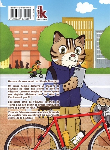 Heureux de vous revoir au Strade Bianche ! Un jeune homme démarre un stage à al boutique de vélos aux allures de café de Véloutre. Comment réagira la patron quand son stagiaire déclarera que les vélos ne l'intéressent pas ? ! L'ex-petite amie de Véloutre, le choix de Tigroo pour son avenir, la grosse engueulade entre le patron et Yôko... Vivez de fabuleuses aventures dans le monde de la petite reine en côtoyant les surprenants clients de la boutique !