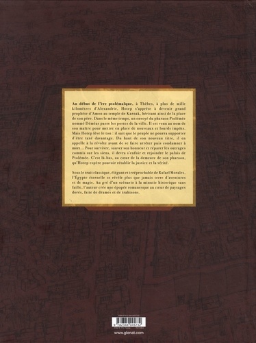 Au début de l'ère Ptolémaïque, à Thèbes, à plus de mille kilomètres d'Alexandrie, Hotep s'apprête à devenir Grand Prophète d'Amon au temple de Karnak, héritant ainsi de la place de son père. Dans le même temps, un envoyé du pharaon Ptolémée nommé Demias passe les portes de la ville. Il est venu au nom de son maitre pour mettre en place de nouveaux et lourds impôts. Mais Hotep lève le ton : il sait que le peuple ne pourra supporter d'être taxé davantage. Du haut de son nouveau titre, il en appelle à la révolte avant de se faire arrêter puis condamner à mort... Pour survivre, sauver son honneur et réparer les outrages commis sur les siens, il devra s'enfuir et rejoindre le palais de Ptolémée. C'est là-bas, au coeur de la demeure de son pharaon qu'Hotep espère pouvoir rétablir la justice et la vérité. Sous le trait classique, élégant et irréprochable de Rafael Morales, l'Egypte éternelle se révèle plus que jamais terre d'aventures et de magie. Au gré d'un scénario à la minutie historique sans faille, le disciple de Jacques Martin installe un oeuvre digne de son maître, une épopée historique au coeur de paysages dorés, faite de drames et de trahisons.