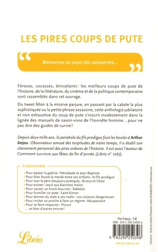 "Bienvenue au pays des saloperies. . ". Féroces, cocasses, étincelants : les meilleurs coups de pute de l'histoire, de la littérature, du cinéma et de la politique contemporaine sont rassemblés dans cet ouvrage. Du tweet félon à la missive parjure, en passant par la cabale la plus sophistiquée ou la petite phrase assassine, cette anthologie jubilatoire et non exhaustive du coup de pute s'inscrit modestement dans la lignée des manuels de savoir-vivre de l'honnête homme... pour ne pas dire des guides de survie !
