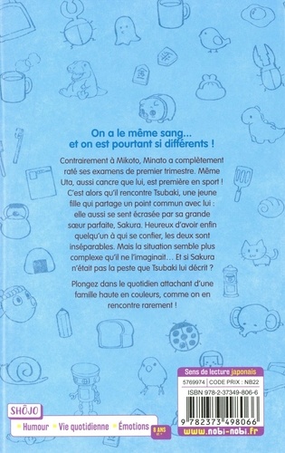 On a le même sang... et on est pourtant si différents ! Contrairement à Mikoto, Minato a complètement raté ses examens de premier trimestre. Même Uta, aussi cancre que lui, est première en sport ! C'est alors qu'il rencontre Tsubaki, une jeune fille qui partage un point commun avec lui : elle aussi se sent écrasée par sa grande soeur parfaite, Sakura. Heureux d'avoir enfin quelqu'un à qui se confier, les deux sont inséparables. Mais la situation semble plus complexe qu'il ne l'imaginait... Et si Sakura n'était pas la peste que Tsubaki lui décrit ? Plongez dans le quotidien attachant d'une famille haute en couleurs, comme on en rencontre rarement !
