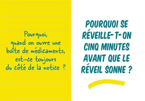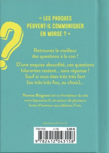 "Les phoques peuvent-ils communiquer en morse ? " Retrouvez le meilleur des questions à la con ! D'une exquise absurdité, ces questions hilarantes restent... sans réponse ! Sauf si vous êtes très très fort (ou très très fou, au choix)...