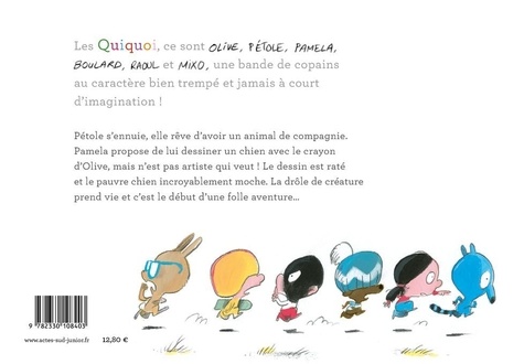 Les Quiquoi, ce sont Olive, Pétole, Pamela, Boulard, Raoul et Mixo, une bande de copains au caractère bien trempé et jamais à court d'imagination ! Pétole s'ennuie, elle rêve d'avoir un animal de compagnie. Pamela propose de lui dessiner un chien avec le crayon d'Olive, mais n'est pas artiste qui veut ! Le dessin est raté et le pauvre chien incroyablement moche. La drôle de créature prend vie et c'est le début d'une folle aventure...
