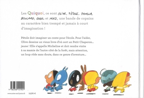 Les Quiquoi, ce sont Olive, Pétole, Pamela, Boulard, Raoul et Mixo, une bande de copains au caractère bien trempé et jamais à court d'imagination ! Pétole doit imaginer un conte pour l'école. Pour l'aider, Olive dessine un vieux livre d'où sort un Petit Chaperon... jaune ! Elle s'appelle Micheline et doit rendre visite à sa mamie de l'autre côté de la forêt, mais attention, un loup rôde sans doute, dans ce genre d'aventure...