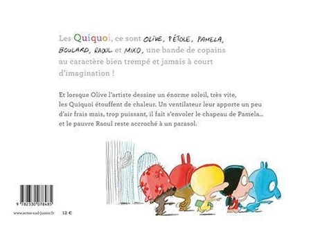 Les Quiquoi, ce sont Olive, Pétole, Pamela, Boulard, Raoul et Mixo, une bande de copains au caractère bien trempé et jamais à court d'imagination ! Et lorsque Olive l'artiste dessine un énorme soleil, très vite, les Quiquoi étouffent de chaleur. Un ventilateur leur apporte un peu d'air frais mais, trop puissant, il fait s'envoler le chapeau de Pamela… et le pauvre Raoul reste accroché à un parasol.