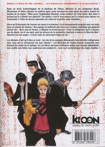Quand le Dieu du Mal menace... les racailles débarquent à la rescousse ! Dans un lycée technologique de la banlieue de Tokyo, Shinichi et ses comparses Ryuji, Masamune et Shiro règnent en maîtres après avoir terrassé les unes après les autres toutes les bandes de la région ! Mais pour l'imbattable Shinichi, cette victoire est trop facile. Que faire à présent qu'il a atteint son objectif ? Se battre, c'est le seul moyen qu'il a trouvé pour apaiser sa frustration à l'idée de devoir reprendre les rênes de la petite usine familiale... Alors qu'il désespère de trouver un voyou à sa hauteur, il est brusquement propulsé avec ses amis dans un monde de fantasy ! Ses poings ne suffisent plus face à la créature maléfique qui apparaît devant lui... Qu'à cela ne tienne, il dégaine la tronçonneuse ! Pour la villageoise qu'il a sauvée, pas de doute, lui et ses amis sont les princes de la prophétie, destinés à vaincre le Dieu du Mal ! Shinichi est aux anges : il tient enfin un adversaire digne de lui ! Les démons n'ont qu'à bien se tenir : les rois de la castagne débarquent, bien décidés à dégommer tous ceux qui se dresseront sur leur chemin ! Les Racailles de l'autre monde renouvelle avec humour les codes de la fantasy. Ici, les héros ont pour meilleures armes leur énergie débordante, leur amitié sans faille, leur expérience du combat et... leur rejet systématique des règles établies !