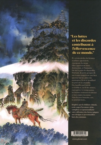 "Les luttes et les discordes contribuent à l'effervescence de ce monde". Il y a trois siècles, les brumes écarlates apparurent, émergeant du néant. Elles apportèrent mort, destruction, et l'humanité fut sur le point de disparaitre. Pourtant, de petits groupes de survivants émigrèrent tant bien que mal sur les cimes des montagnes, là où la brume ne pouvait les atteindre. Ainsi, des familles parvinrent à s'établir et, au fil des années, à prospérer... Le temps passa, les brumes restèrent invaincues et leur origine inconnue, mais les jeux humains se poursuivirent. Aujourd'hui, rivalités, alliances et trahisons dirigent Qingpiu, Tieliu et Danzhu, les trois royaumes qui composent le monde. Pour asseoir son hégémonie, le royaume Qingpiu est enfin parvenu à négocier une alliance avec celui de Tieliu. L'enjeu est de taille : un mariage politique qui pourrait signer le proche trépas du royaume Danzhu. Pourtant, le jour de la rencontre entre la princesse de Tieliu et l'émissaire de Qingpiu, rien ne se passe comme prévu. Les soldats de Danzhu attaquent, les brumes écarlates encerclent la ville et un mystérieux groupe de " Rebelles " fait son apparition... Récit de fantasy inspiré du folklore chinois, le premier tome des Brumes Ecarlates est porté par un dessin virtuose, fourmillant, précis et expressif qui s'embellit d'incroyables ambiances colorées et chatoyantes. Une saga d'aventure riche, complexe et époustouflante dans laquelle s'affrontent des héros épiques aux design et personnalités hors du commun.