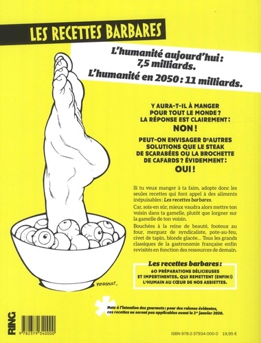 L'humanité aujourd'hui : 7, 5 milliards. L'humanité en 2050 : 11 milliards. Y aura-t-il à manger pour tout le monde ? La réponse est clairement : NON ! Peut-on envisager d'autres solutions que le steak de scarabées ou la brochette de cafards ? Evidemment : OUI ! Si tu veux manger à ta faim, adopte donc les seules recettes qui font appel à des aliments inépuisables : Les recettes barbares. Car, sois-en sûr, mieux vaudra alors mettre ton voisin dans ta gamelle, plutôt que lorgner sur la gamelle de ton voisin. Bouchées à la reine de beauté, footeux au four, merguez de syndicaliste, pote-au-feu, civet de tapin, blonde glacée... Tous les grands classiques de la gastronomie française enfin revisités en fonction des ressources de demain. Les recettes barbares : 60 préparations délicieuses et impertinentes, qui remettent (enfin ! ) l'humain au coeur de nos assiettes. Note à l'intention des gourmets : pour des raisons évidentes, ces recettes ne seront pas applicables avant le 1er janvier 2030.