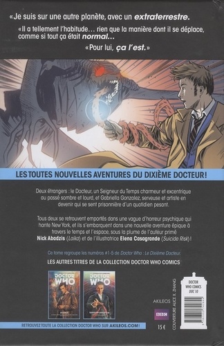 Deux étrangers : le Docteur, un Seigneur du Temps charmeur et excentrique au passé sombre et lourd, et Gabriella Gonzolez, serveuse et artiste en devenir qui se sent prisonnière d'un quotidien pesant. Tous deux se retrouvent emportés dans une vague d'horreur psychique qui hante New York, et ils s'embarquent dans une nouvelle aventure épique à travers le temps et l'espace, sous la plume de l'auteur primé Nick Abadzis (Laika) et de l'illustratrice Elena Casagrande (Suicide Risk) !