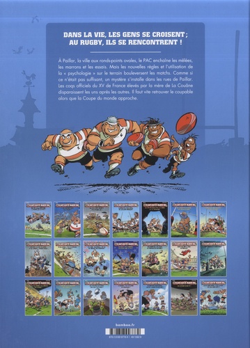 Dans la vie, les gens se croisent ; au rugby, ils se rencontrent ! A Paillar, la ville aux ronds-points ovales, le PAC enchaîne les mêlées, les marrons et les essais. Mais les nouvelles règles et l'utilisation de la "psychologie" sur le terrain bouleversent les matchs. Comme si ce n'était pas suffisant, un mystère s'installe dans les rues de Paillar. Les coqs officiels du XV de France élevés par la mère de La Couâne disparaissent les uns après les autres. Il faut vite retrouver le coupable alors que la Coupe du monde approche.