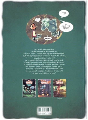 La petite Sam a un don : elle parle aux esprits. Ce qui complique un peu la vie de Tim, son grand frère qui s'occupe d'elle depuis la mort de leur père... Surtout quand Sam rate l'école pour suivre Malo, un chat fantôme qui l'emmène chez son défunt maître, Guy, un esprit en transit ! Car Guy veut terminer une mission avant de partir vers l'au-delà : remettre au conservateur du musée ses recherches au sujet d'un mystérieux trésor. Problème : le dossier du vieil homme a disparu. Et sa mort n'est peut-être pas si naturelle que ça... Le deuxième épisode de la nouvelle série de Carbone (La Boîte à musique, Dans les yeux de Lya, La Sentinelle du Petit Peuple), toujours accompagnée de Julien Monier. Une saga jeunesse à la fois inventive, palpitante touchante et pleine d'humour !