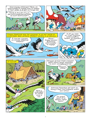 Depuis très longtemps, les cigognes transportent les Schtroumpfs lors de leurs déplacements lointains. Cette fois encore, trois d'entre elles se dévouent pour conduire une délégation de Schtroumpfs chez le mage Homnibus à l'occasion de son anniversaire. Mais, pour le retour, les cigognes d'habitude si ponctuelles ne sont pas au rendez-vous...