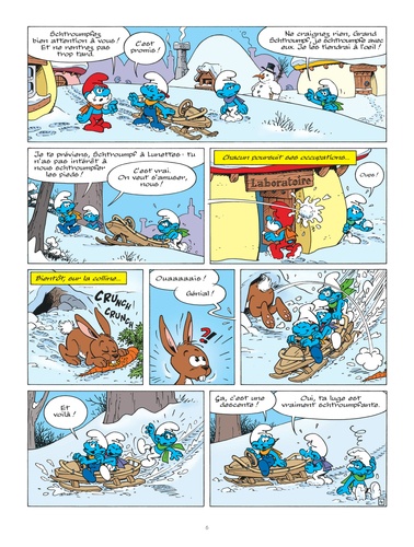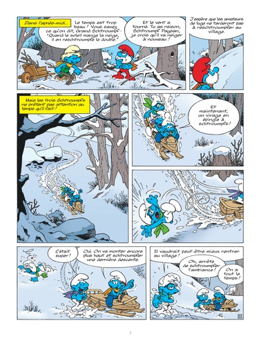 Comme chaque année, les premiers frimas sont attendus de pied ferme par les Schtroumpfs, qui se sont bien préparés. Mais personne ne s'attendait à un tel blizzard ! Partis tester une nouvelle luge, les Schtroumpfs Farceur, à Lunettes et Bricoleur se retrouvent coupés d'un village qui s'organise tant bien que mal. Ils trouvent refuge chez un sourcier acariâtre, qui a pourtant tout fait pour fuir la vie en communauté. Et si le salut des uns schtroumpfait par celui des autres ?