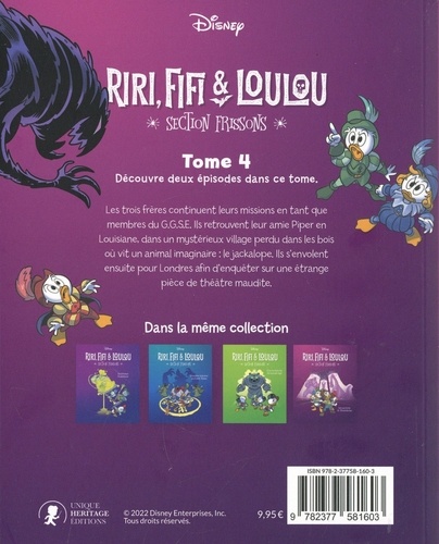 Découvrez le quatrième tome des aventures frissonnantes de Riri, Fifi et Loulou en mode chasseurs de fantômes ! Cette bande dessinée de 96 pages comprend une présentation des personnages et 2 épisodes. A lire dès 7 ans. Riri, Fifi et Loulou continuent leurs missions en tant que membres du G. G. S. E. Ils retrouvent leur amie Piper en Louisiane, dans un mystérieux village perdu dans les bois où vit un animal imaginaire : le jackalope. Ils s'envolent ensuite pour Londres afin d'enquêter sur une étrange pièce de théâtre maudite. Episode 1 : Les trois canetons rejoignent leur amie Piper en Louisiane afin de percer le mystère entourant un village perdu dans le bayou. Ici, les habitants ne vieillissent pas et des animaux imaginaires comme le jackalope se promènent dans les bois. Episode 2 : Il y a longtemps, à Londres, la pièce de théâtre du grand Duckspeare a été maudite par le Seigneur des ombres ! Les comédiens, devenus des fantômes condamnés à le servir pour l'éternité, demandent à présent l'aide de nos trois héros.