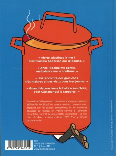 "Alerte, plastique à mer ! C'est Pamela Anderson qui se baigne." "Anne Hidalgo me gonfle, ma balance me le confirme." "J'ai rencontré des gros cons très maigres et des vieux cons très jeunes." "Quand Macron lance la balle à son chien, c'est Castaner qui la rapporte." Quand il ne taille pas des costards sur scène aux puissants, Bernard Mabille les cuisine maison, revenant avec mordant sur les grands événements et les moments cocasses de l'année, en France comme à l'étranger. L'ingrédient secret de ses recettes irrésistibles ? Le rire, bien sûr. Avec ce farceur depuis 1976, tout le monde passe à table !