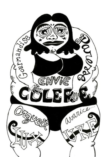On pourrait appeler ça Les 7 péchés du grand capital. J'ai en effet pris l'option de dessiner les 7 péchés sous le prisme du capitalisme et des ses dérives... La gourmandise se transforme en junk food, la paresse en gueule de bois, les pauvres meurent d'envie de ressembler aux si beaux riches... rêve inaccessible qui déclenche une grande colère... l'orgueil pousse les portes de la chirurgie esthétique du futur, l'avarice engendre les morts les plus riches du cimetière et, pour finir, des anges obèses invitent des squelettes pour une scène de luxure aérienne... Humour noir, décalé, ça pique. Un peu. C'est un jeu, c'est une danse. Une danse burlesque avec une partenaire nommée Angoisse.