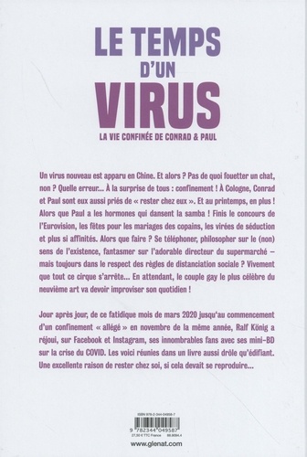 Le confinement de Conrad et Paul ! Un jour, un nouveau virus apparaît en Chine. Quelques mois plus tard, l'Humanité se voit cloîtrée à la maison ! A Cologne, Conrad et Paul n'échapperont pas au confinement. Finis le concours de l'Eurovision, le coiffeur et les mariages gay, seul subsiste un triste constat : tandis que les Allemands stockent du P. Q. , les Français se ruent sur le vin rouge et les capotes. La frustration est grande, et bien entendu c'est au printemps que la catastrophe se déclare ! Pile au moment où les hormones de Paul commencent à danser la samba... Alors que faire ? On se téléphone, on philosophe, on tombe amoureux de l'adorable directeur du supermarché mais toujours dans le respect des règles de distanciation sociale. Vivement que tout ce cirque s'arrête... En attendant nos deux acolytes vont devoir improviser leur quotidien ! Ralf König nous raconte avec humour et dérision le confinement en nous plongeant dans celui de ses deux plus fameux personnages. Un ouvrage drôle et rafraîchissant, truffé d'anecdotes loufoques et de commentaires pertinents.