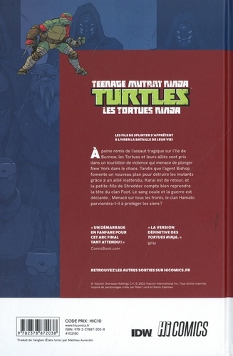 Les fils de Splinter s'apprêtent à livrer la bataille de leur vie ! A peine remis de l'assaut tragique sur l'île de Burnow, les Tortues et leurs alliés sont pris dans un tourbillon de violence qui menace de plonger New York dans le chaos. Tandis que l'agent Bishop fomente un nouveau plan pour détruire les mutants grâce à un allié inattendu, Karai est de retour, et la petite-fille de Shredder compte bien reprendre la tête du clan Foot. Le sang coule et la guerre est déclarée... Menacé sur tous les fronts, le clan Hamato parviendra-t-il à protéger les siens ? "Un démarrage en fanfare pour cet arc final tant attendu ! " ComicBook. com " La version définitive des Tortues Ninja. " BFM