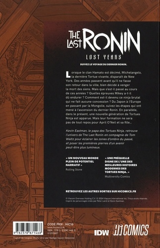 Lorsque le clan Hamato est décimé, Michelangelo, la dernière Tortue vivante, disparaît de New York. Des années passent avant qu'il ne fasse son retour dans la ville, bien décidé à venger la mort des siens. Mais que s'est-il passé au cours de ces années ? Quelles épreuves Mikey a-t-il dé endurer ? Comment est-il devenu ce ninja brutal qui ne fait aucune concession ? Du Japon à l'Europe en passant parla Mongolie, suivez les étapes qui ont mené à l'ascension du dernier Ronin. En parallèle, dans le présent, une nouvelle génération de Tortues Ninja est apparue. Mais leur formation ne sera, pas de tout repos pour April O'Neil et sa fille...