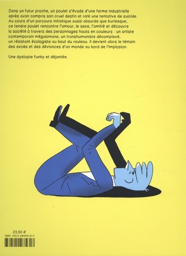 Un poulet candide et épris de liberté traverse un monde hyperconnecté au bord de l'implosion. Une joyeuse dystopie, funky et déjantée. Dans un futur proche, un poulet s'évade d'une ferme industrielle après avoir compris son cruel destin et raté une tentative de suicide. Au cours d'un parcours initiatique aussi absurde que burlesque, ce tendre poulet rencontre le sexe, l'amour, l'amitié et découvre la société à travers des personnages un peu extrêmes et hauts en couleurs : un résistant écologique, un transhumaniste décomplexé, un artiste contemporain improbable... Il devient alors le témoin des excès et déviances du monde actuel dans un contexte de crise marqué par des manifestations incessantes, des violences policières, un capitalisme effréné, l'omniprésence du langage publicitaire, la dictature de la technologie et de l'hyperconnectivité. Cet album propose, sous la forme d'un récit décalé et picaresque, une vision critique de la société où l'absurdité est devenue la norme.