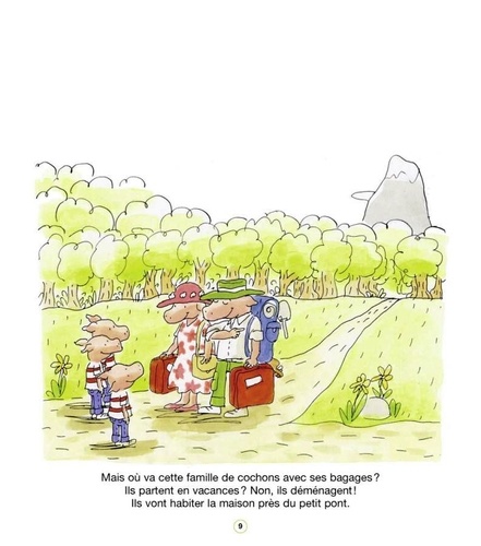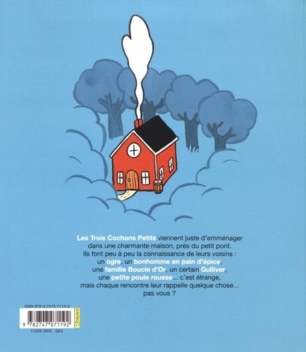 Les trois cochons petits viennent juste d'emménager dans une charmante maison, près du petit pont. Ils font peu à peu la connaissance de leurs voisins : un ogre, un bonhomme en pain d'épice, une famille Boucle d'Or, un certain Gulliver, une petite poule rousse, ... c'est étrange, mais chaque rencontre leur rappelle quelque chose... pas vous ?