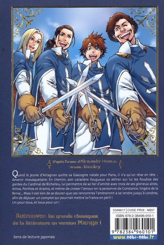 Quand le jeune d'Artagnan quitte sa Gascogne natale pour Paris, il n'a qu'un rêve en tête : devenir mousquetaire. En chemin, son caractère fougueux va attirer sur lui les foudres des gardes du Cardinal de Richelieu, lui permettre de se lier d'amitié avec trois de ses glorieux aînés, Athos, Porthos et Aramis, et même de croiser l'amour en la personne de Constance, lingère de la Reine... Mais il est loin de se douter que ces rencontres l'amèneront à se rendre jusqu'à Londres, afin de déjouer un complot qui pourrait mettre la France en péril ! Un pour tous, et tous pour un ! Retrouvez les grands classiques de la littérature en version Manga !