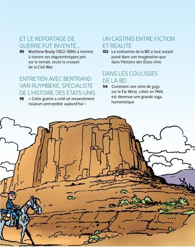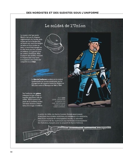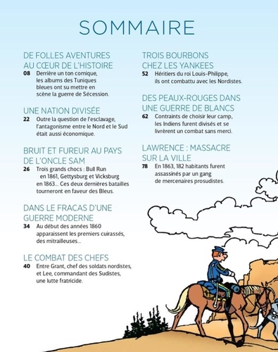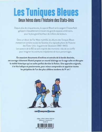 Et si vous remontiez le temps en compagnie du caporal Blutch et du sergent Chesterfield, l'un des tandems le plus célèbre de la bande dessinée, pour découvrir toutes les facettes de la guerre de Sécession, ce conflit qui bouleversa à jamais l'Amérique ? Depuis plus de cinquante ans, les deux soldats emblématiques offrent des aventures rocambolesques à plusieurs millions de lecteurs passionnés par cette saga à la fois historique et humoristique. Dans un décor de Far West, Les Tuniques Bleues mettent en scène la guerre de Sécession (1861-1865) à travers des albums riches en gags et en rebondissements ! Avec cet ouvrage, partez au galop sur les traces des deux héros et de leur régiment : plongez au coeur de l'Amérique, dans les principales batailles qui marquèrent la guerre civile ; découvrez la rivalité entre les grands chefs (Lee et Grant) dans cette lutte fratricide, mais aussi le rôle joué par les Indiens, la délicate question de l'esclavage, le conflit économique entre le Nord et le Sud... En s'appuyant sur des photographies d'archives et les illustrations de la célèbre BD, journalistes et historiens décryptent les aventures des Tuniques Bleues et confrontent la réalité historique à l'univers de cette série culte. Une approche originale, à la fois instructive, ludique et passionnante !