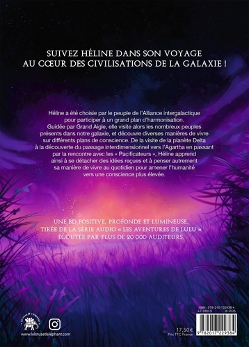 Suivez Héline dans son voyage au coeur des civilisations de la galaxie ! Héline a été choisie par le peuple de l'Alliance intergalactique pour participer à un plan d'harmonisation. Guidée par Grand Aigle, elle visite alors de nombreux peuples présents dans notre galaxie, et découvre diverses manières de vivre sur diférents plans de conscience. De la visite de la planète Delta à la découverte du passage interdimentionnel vers l'Agartha en passant par la rencontre avec les "Pacificateurs", Héline apprend ainsi à se détacher des idées reçues et à penser autrement sa manière de vivre au quotidien pour amener l'humanité vers une conscience plus élevée. UNE BD POSITIVE , PROFONDE ET LUMINEUSE, TIREE DE LA SERIE AUDIO "LES AVENTURES DE LULU" ECOUTEE PAR PLUS DE 20000 AUDITEURS !