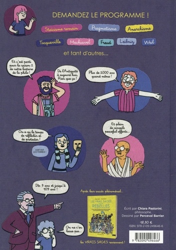 Une histoire de la philo en BD ! L'équipe des Vrais Sages s'agrandit ! 45 nouveaux philosophes nous invitent à penser par nous-même Sénèque, Machiavel, Pascal, Leibniz, Hegel, Tocqueville, Freud , Heidegger, Bergson, Popper, Simone Weil, Deleuze, Derrida, Gandhi, Foucault, Judith Butler... et beaucoup d'autres ! 45 philosophes, hommes et femmes, de l'Antiquité à aujourd'hui nous invitent à nous interroger sur notre place dans le monde, notre rôle, notre liberté de penser et d'agir. Une plongée vivante et pleine d'humour à leurs côtés pour comprendre leurs questions, leurs réponses et comprendre comment chacune de ces pensées peut encore nous parler aujourd'hui. Un livre pour découvrir en quoi la philosophie peut nous éclairer sur la façon de conduire notre vie, nous permettre d'acquérir un esprit critique et de fournir des outils pour se construire une sagesse personnelle ! Une autre façon de parler de philo aux enfants, plus incarnée, à travers des histoires personnelles, des anecdotes, de l'humour. Une autre façon de parler de philo aux enfants, plus incarnée, à travers des histoires personnelles, des anecdotes, de l'humour. Une Bande-dessinée pour toute la famille, dès 9 ans
