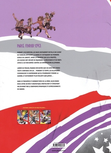 La libération est proche... Paris. Durant l'occupation, les nazis instaurent en ville un climat de terreur, diffusent la haine et s'attaquent au moindre espace de liberté. Après avoir vécu une tragédie, les Zazous ont décidé de rejoindre la résistance et de participer à l'action armée contre les envahisseurs allemands. Frankie est libéré de prison mais trouve ses amis complètement changés... ils ne lui font presque plus confiance. Pendant ce temps, les Allemands commencent à comprendre qu'ils pourraient perdre la guerre, et dans leur désespoir, deviennent plus violents que jamais. Mais dans cette lutte armée, même lorsqu'on oeuvre pour la résistance, une autre menace plane... celle de devenir comme eux. A travers cette trilogie historique, nous entrons dans le monde des zazous, ces danseurs, musiciens et rebelles dans l'âme qui luttent contre la barbarie. Dans ce troisième et dernier tome de la série, Salva Rubio nous offre un récit dramatique, virevoltant et émouvant mis en avant par le graphisme dynamique et expressionniste de Danide.