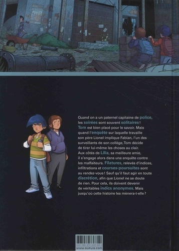 Quand on a un paternel capitaine de police, les soirées sont souvent solitaires ! Tom est bien placé pour le savoir. Mais quand l'enquête sur laquelle travaille son père Lionel implique Fabian, l'un des surveillants de son collège,Tom décide de tirer lui-même les choses au clair. Aux côtés de Lilia, sa meilleure amie, il s'engage alors dans une enquête contre les malfaiteurs. Filatures, relevés d'indices, infiltrations et courses-poursuites sont au rendez-vous ! Sauf qu'il faut agir en toute discrétion, afin que Lionel ne se doute de rien. Pour cela, ils doivent devenir de véritables indics anonymes. Mais jusqu'où cette histoire les mènera-t-elle ?