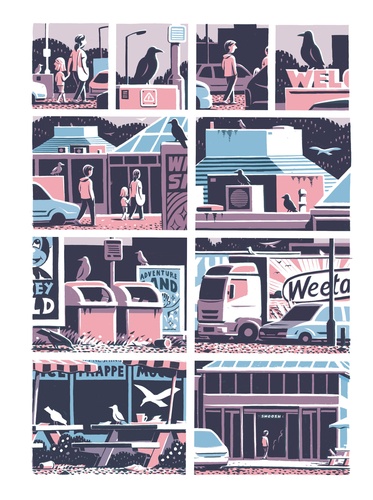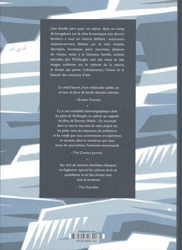 Une famille part pour un séjour dans un camp de bungalows sur la côte britannique. Les décors familiers à tout à chacun défilent : autoroute, stations-services, falaises sur la mer, musées décrépits, boutiques pour touristes, absence de réseau, visite à la lointaine famille, amitiés estivales. Jon McNaught met des mots et des images sublimes sur le rythme de la nature, le temps qui passe, l'adolescence, l'ennui et la beauté des vacances d'été avec un talent unique : transformer l'ordinaire en extraordinaire.