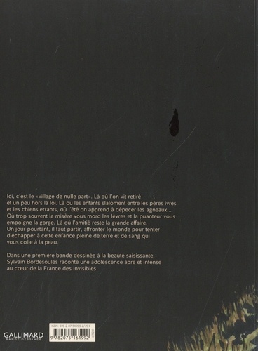 Dans une première bande dessinée à la beauté saisissante, Sylvain Bordesoules raconte une adolescence âpre et intense au coeur de la France des invisibles. Ici, c'est le "village de nulle part". Là où l'on vit retiré et un peu hors la loi. Là où les enfants slaloment entre les pères ivres et les chiens errants, où l'été on apprend à dépecer les agneaux... Où trop souvent la misère vous mord les lèvres et la puanteur vous empoigne la gorge. Là où l'amitié reste la grande affaire. Un jour pourtant, il faut partir, affronter le monde pour tenter d'échapper à cette enfance pleine de terre et de sang qui vous colle à la peau.