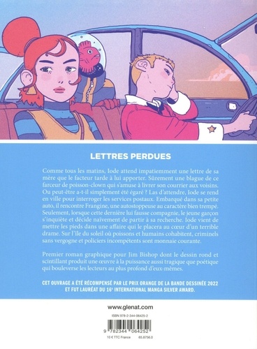 Comme tous les matins, Iode attend impatiemment une lettre de sa mère que le facteur tarde à lui apporter. Sûrement une blague de ce farceur de poisson-clown qui s'amuse à livrer son courrier aux voisins. Ou peut-être a-t-il simplement été égaré ? Las d'attendre, Iode se rend en ville pour interroger les services postaux. Embarqué dans sa petite auto, il rencontre Frangine, une autostoppeuse au caractère bien trempé. Seulement, lorsque cette dernière lui fausse compagnie, le jeune garçon s'inquiète et décide naïvement de partir à sa recherche. lode vient de mettre les pieds dans une affaire qui le placera au coeur d'un terrible drame. Sur l'île du soleil où poissons et humains cohabitent, criminels sans vergogne et policiers incompétents sont monnaie courante. Premier roman graphique pour Jim Bishop dont le dessin rond et scintillant produit une oeuvre à la puissance aussi tragique que poétique qui bouleverse les lecteurs au plus profond d'eux-mêmes. CET OUVRAGE A ETE RECOMPENSE PAR LE PRIX ORANGE DE LA BANDE DESSINEE 2022 ET FUT LAUREAT DU 16e INTERNATIONAL MANGA SILVER AWARD.