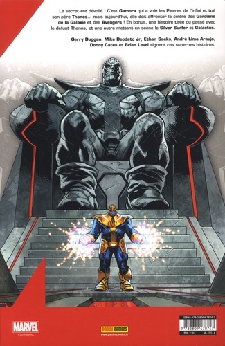 Le secret est dévoilé ! C'est Gamora qui a volé les Pierres de l'Infini et tué son père Thanos... mais aujourd'hui, elle doit affronter la colère des Gardiens de la Galaxie et des Avengers ! En bonus, une histoire tirée du passé avec le défunt Thanos, et une autre mettant en scène le Silver Surfer et Galactus. Gerry Duggan, Mike Deodato Jr, Ethan Sacks, André Lima Araujo, Donny Cates et Brian Leval signent ces superbes histoires.