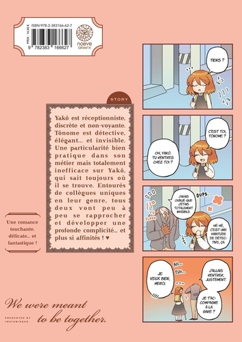Yakô est réceptionniste, discrète et non-voyante. Tônome est détective, élégant... et invisible. Une particularité bien pratique dans son métier mais totalement inefficace sur Yakô, qui sait toujours où il se trouve. Entourés de collègues uniques en leur genre, tous deux vont peu à peu se rapprocher et développer une profonde complicité... et plus si affinités ! Une romance touchante, délicate... et fantastique !