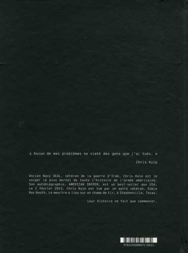 Chris Kyle est un héros. Ancien sniper chez les Navy Seal durant la deuxième guerre d'Irak, il a tué plus de 160 " cibles ". Au faîte de sa gloire (Clint Eastwood a même acheté les droits de son autobiographie, bestseller aux Etats-Unis, pour en faire un film ? ce sera American Sniper), Chris Kyle dédie sa vie à aider ses anciens camarades de combats marqués aussi bien physiquement que mentalement par la guerre. Eddie Ray Routh est l'un d'entre eux. Le 2 février 2013, l'inconnu EDDIE RAY ROUTH abat la Légende Chris Kyle. Ce livre raconte l'histoire raconte le crime ? et ses conséquences.